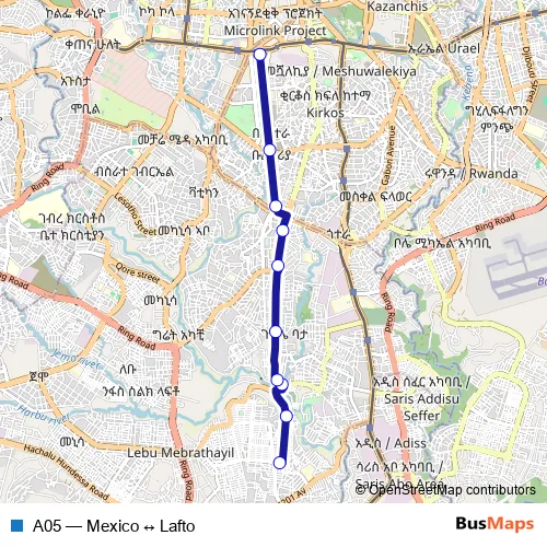 The first stop of the A05 bus route is Lafto and the last stop is Mexico. A05 (Mexico ↔ Lafto) is operational during በየቀኑ.