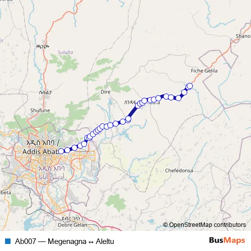The first stop of the Ab007 bus route is Megenagna and the last stop is Aleltu. Ab007 (Megenagna ↔ Aleltu) is operational during በየቀኑ.