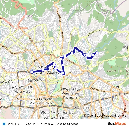The first stop of the Ab013 bus route is Raguel Church and the last stop is Bela Mazorya. Ab013 (Raguel Church ↔ Bela Mazorya) is operational during በየቀኑ.