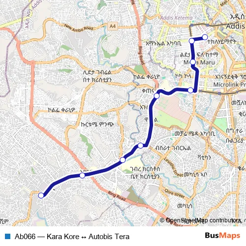 The first stop of the Ab066 bus route is Kara Kore and the last stop is Autobis Tera. Ab066 (Kara Kore ↔ Autobis Tera) is operational during በየቀኑ.