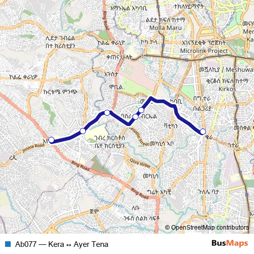 The first stop of the Ab077 bus route is Kera and the last stop is Ayer Tena. Ab077 (Kera ↔ Ayer Tena) is operational during በየቀኑ.