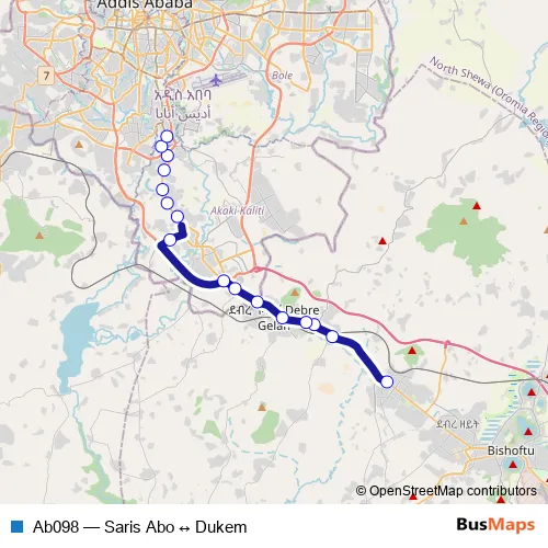 The first stop of the Ab098 bus route is Dukem and the last stop is Saris Abo. Ab098 (Saris Abo ↔ Dukem) is operational during በየቀኑ.