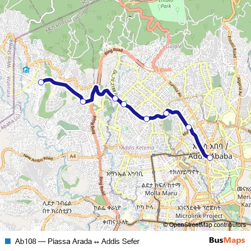 The first stop of the Ab108 bus route is Piassa Arada and the last stop is Addis Sefer. Ab108 (Piassa Arada ↔ Addis Sefer) is operational during በየቀኑ.