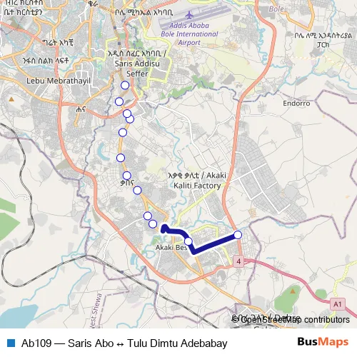 The first stop of the Ab109 bus route is Tulu Dimtu Adebabay and the last stop is Saris Abo. Ab109 (Saris Abo ↔ Tulu Dimtu Adebabay) is operational during በየቀኑ.