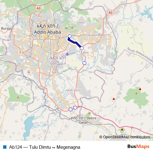 The first stop of the Ab124 bus route is Megenagna and the last stop is Tulu Dimtu. Ab124 (Tulu Dimtu ↔ Megenagna) is operational during በየቀኑ.
