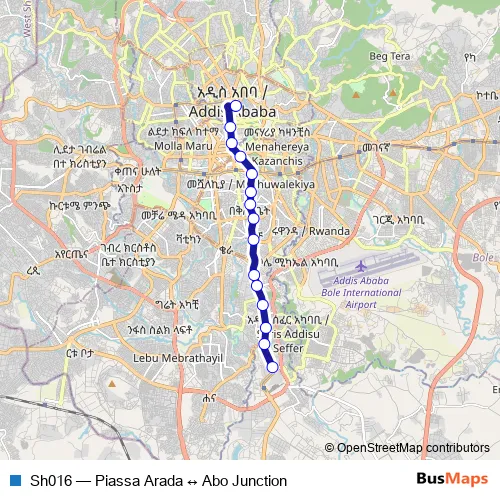 The first stop of the Sh016 bus route is Piassa Arada and the last stop is Abo Junction. Sh016 (Piassa Arada ↔ Abo Junction) is operational during በየቀኑ.