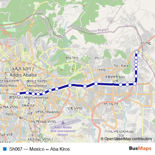 The first stop of the Sh067 bus route is Aba Kiros and the last stop is Mexico. Sh067 (Mexico ↔ Aba Kiros) is operational during በየቀኑ.