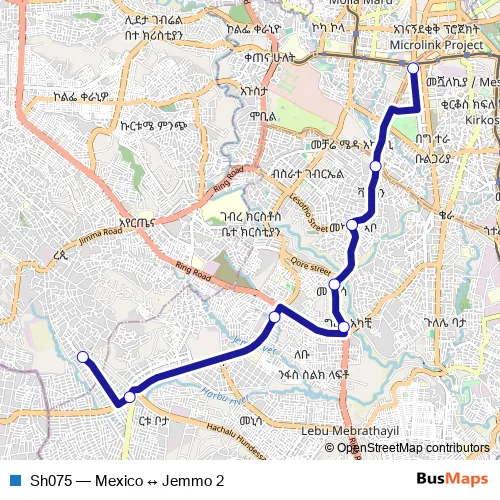 The first stop of the Sh075 bus route is Mexico and the last stop is Jemmo 2. Sh075 (Mexico ↔ Jemmo 2) is operational during በየቀኑ.