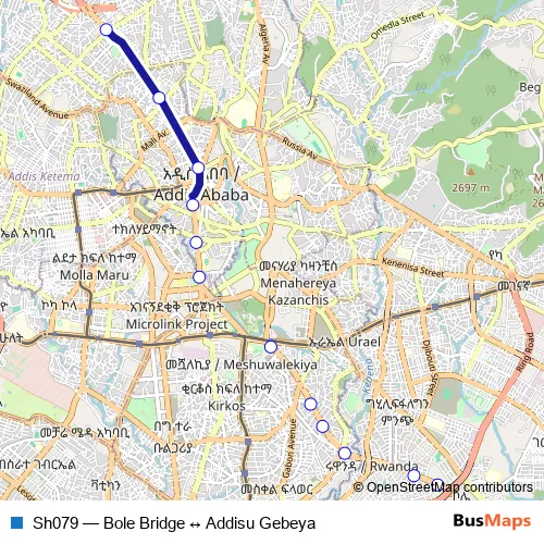 The first stop of the Sh079 bus route is Addisu Gebeya and the last stop is Bole Bridge. Sh079 (Bole Bridge ↔ Addisu Gebeya) is operational during በየቀኑ.