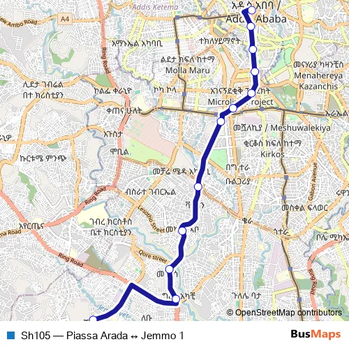 The first stop of the Sh105 bus route is Piassa Arada and the last stop is Jemmo 1. Sh105 (Piassa Arada ↔ Jemmo 1) is operational during በየቀኑ.