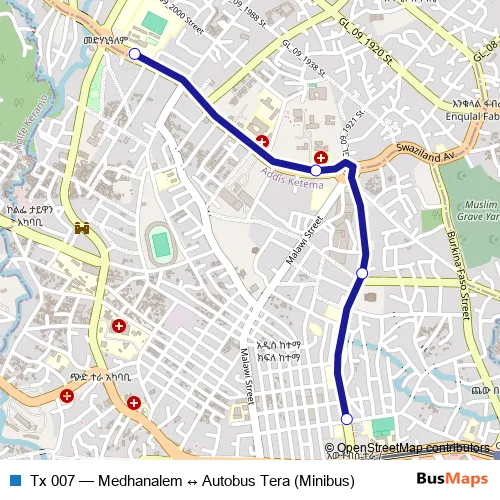 Medhanialem. Tx 007 (Medhanalem ↔ Autobus Tera (Minibus)) is operational during በየቀኑ.