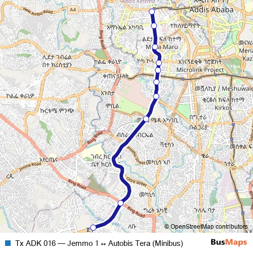 The first stop of the Tx ADK 016 bus route is Autobus Tera and the last stop is Jemmo 1. Tx ADK 016 (Jemmo 1 ↔ Autobis Tera (Minibus)) is operational during በየቀኑ.