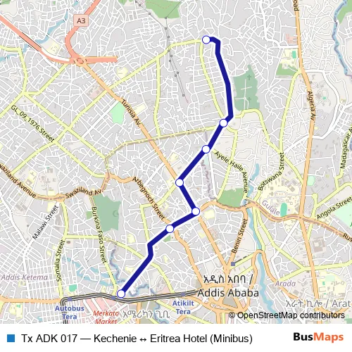 The first stop of the Tx ADK 017 bus route is Eritrea Hotel and the last stop is Kechenie. Tx ADK 017 (Kechenie ↔ Eritrea Hotel (Minibus)) is operational during በየቀኑ.
