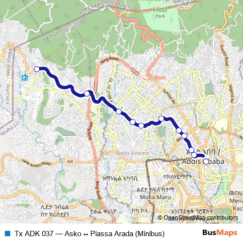 The first stop of the Tx ADK 037 bus route is Asko and the last stop is Piassa Arada. Tx ADK 037 (Asko ↔ Piassa Arada (Minibus)) is operational during በየቀኑ.