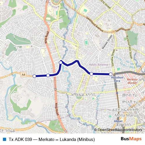 The first stop of the Tx ADK 039 bus route is Merkato and the last stop is Luwkanda. Tx ADK 039 (Merkato ↔ Lukanda (Minibus)) is operational during በየቀኑ.