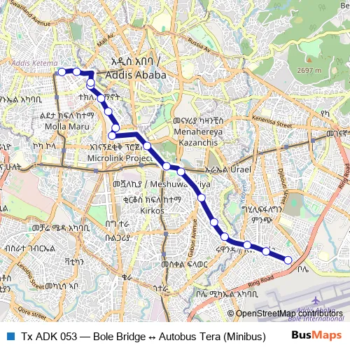 The first stop of the Tx ADK 053 bus route is Bole Millenium and the last stop is Autobus Tera. Tx ADK 053 (Bole Bridge ↔ Autobus Tera (Minibus)) is operational during በየቀኑ.