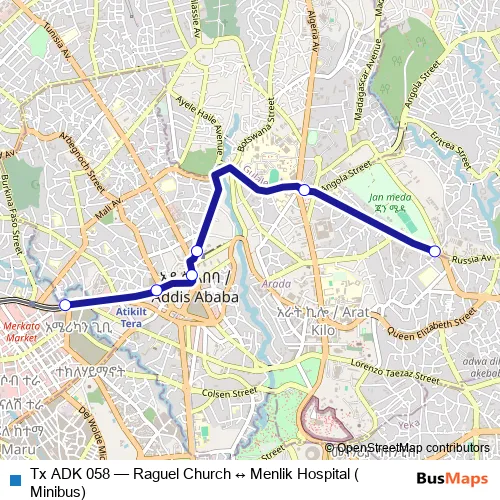 The first stop of the Tx ADK 058 bus route is Menelik II Hospital and the last stop is Raguel Church. Tx ADK 058 (Raguel Church ↔ Menlik Hospital (Minibus)) is operational during በየቀኑ.