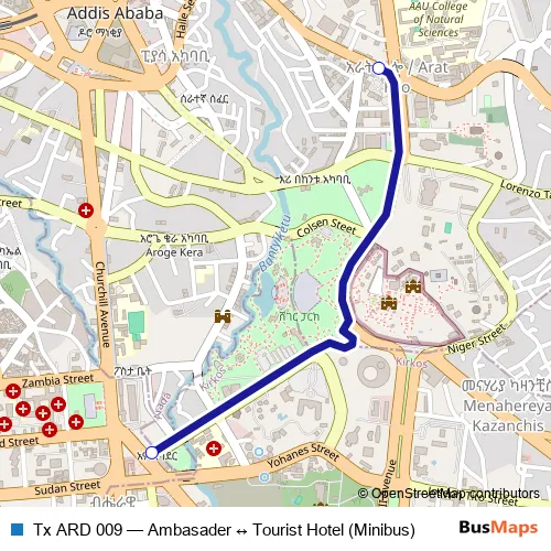 The first stop of the Tx ARD 009 bus route is Tourist Hotel and the last stop is Ambasader. Tx ARD 009 (Ambasader ↔ Tourist Hotel (Minibus)) is operational during በየቀኑ.