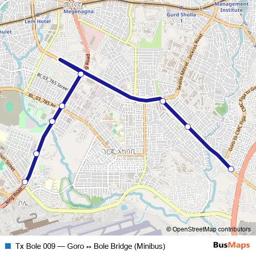 The first stop of the Tx Bole 009 bus route is Goro and the last stop is Bole Bridge. Tx Bole 009 (Goro ↔ Bole Bridge (Minibus)) is operational during በየቀኑ.