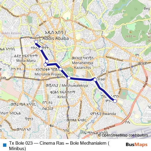 The first stop of the Tx Bole 023 bus route is Bole Medhanyalem and the last stop is Cinema Ras. Tx Bole 023 (Cinema Ras ↔ Bole Medhanialem (Minibus)) is operational during በየቀኑ.