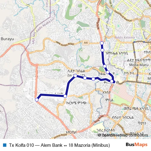 The first stop of the Tx Kolfa 010 bus route is Alem Bank and the last stop is 18 Mazoria. Tx Kolfa 010 (Alem Bank ↔ 18 Mazoria (Minibus)) is operational during በየቀኑ.