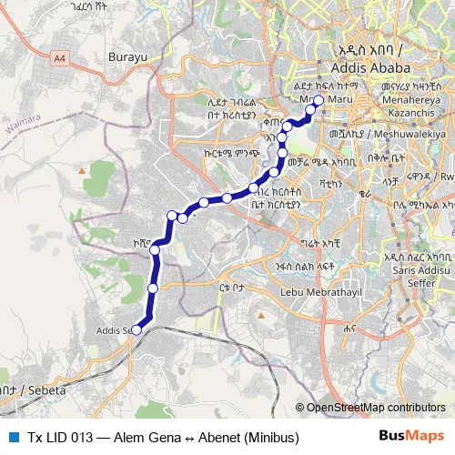 The first stop of the Tx LID 013 bus route is Alem Gena and the last stop is Abenet. Tx LID 013 (Alem Gena ↔ Abenet (Minibus)) is operational during በየቀኑ.