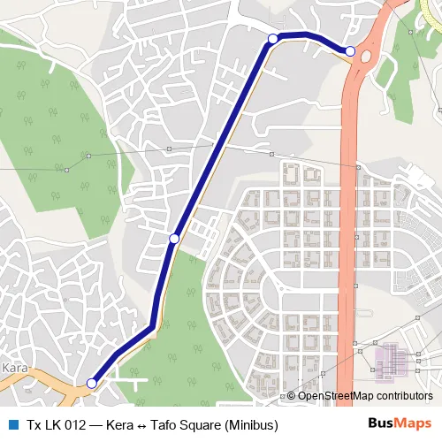 The first stop of the Tx LK 012 bus route is Tafo Square and the last stop is Kara. Tx LK 012 (Kera ↔ Tafo Square (Minibus)) is operational during በየቀኑ.