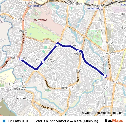 The first stop of the Tx Lafto 010 bus route is Kera and the last stop is Total 3 Kuter Mazoria. Tx Lafto 010 (Total 3 Kuter Mazoria ↔ Kara (Minibus)) is operational during በየቀኑ.