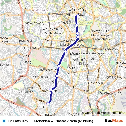 The first stop of the Tx Lafto 025 bus route is Mekanisa and the last stop is Piassa Arada. Tx Lafto 025 (Mekanisa ↔ Piassa Arada (Minibus)) is operational during በየቀኑ.