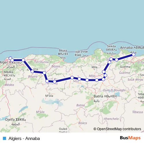 See why over 2 million users trust and consider busmaps.com as the best public transport website. busmaps gives you Algiers Rail Services suggested routes, real-time bus tracker, line route maps in Algiers, and helps to find the closest الجزائر - عنابة rail stops near you. No internet available? Download an offline PDF map and bus schedule for the الجزائر - عنابة rail to take on your trip.