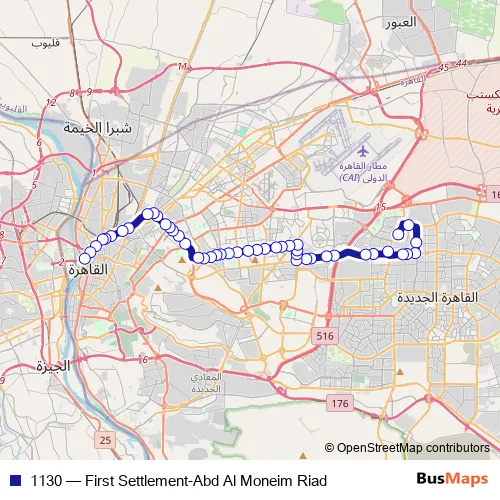 The first stop of the 1130 bus route is 1st Settlement (Tagamoa Awwal) and the last stop is Abd Al Moneim Riad. 1130 (First Settlement-Abd Al Moneim Riad) is operational during يومياً.