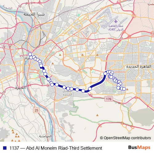 The first stop of the 1137 bus route is Abd Al Moneim Riad and the last stop is 3rd Settlement (Tagamoa Thaleth). 1137 (Abd Al Moneim Riad-Third Settlement) is operational during يومياً.
