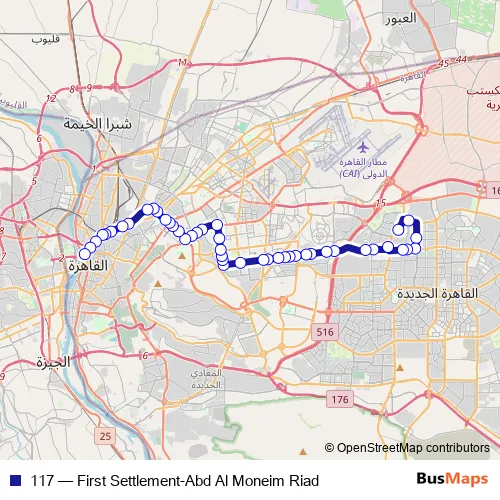 The first stop of the 117 bus route is 1st Settlement (Tagamoa Awwal) and the last stop is Abd Al Moneim Riad. 117 (First Settlement-Abd Al Moneim Riad) is operational during يومياً.
