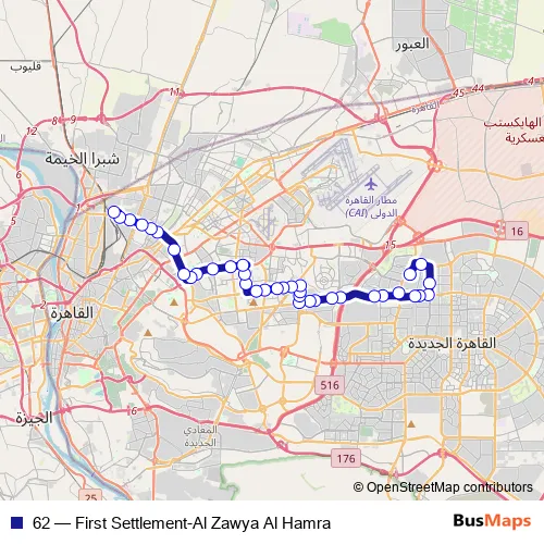 See why over 2 million users trust and consider busmaps.com as the best public transport website. busmaps gives you Cairo Buses suggested routes, real-time bus tracker, line route maps in Cairo, and helps to find the closest 62 bus stops near you. No internet available? Download an offline PDF map and bus schedule for the 62 bus to take on your trip.