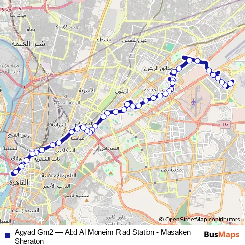 The first stop of the Agyad Gm2 bus route is Sun City Mall and the last stop is Abd Al Moneim Riad. Agyad Gm2 (Abd Al Moneim Riad Station - Masaken Sheraton) is operational during عطلة نهاية الأسبوع.