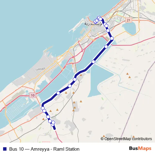 The first stop of the Bus 10 bus route is Raml Station and the last stop is Amreya Station. Bus 10 (Amreyya - Raml Station) is operational during يومياً.