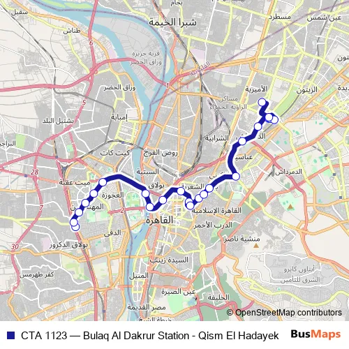 The first stop of the CTA 1123 bus route is Bulaq Dakrur and the last stop is Hadayek Al Qobba Police Station. CTA 1123 (Bulaq Al Dakrur Station - Qism El Hadayek) is operational during يومياً.