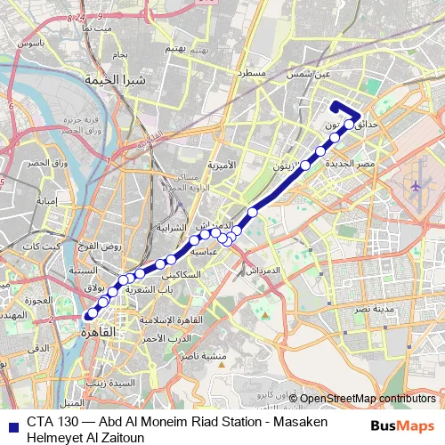 The first stop of the CTA 130 bus route is Misr Al Gadida Military Hospital and the last stop is Abd Al Moneim Riad. CTA 130 (Abd Al Moneim Riad Station - Masaken Helmeyet Al Zaitoun) is operational during يومياً.