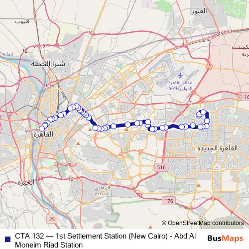 Click here to view the nearest CTA 132 - 1st Settlement Station (New Cairo) - Abd Al Moneim Riad Station bus stop.