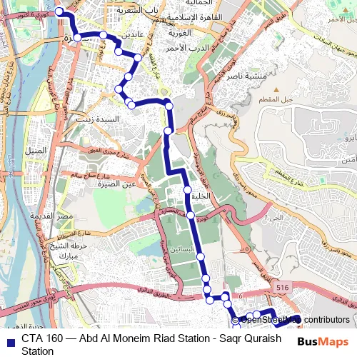 The first stop of the CTA 160 bus route is Abd Al Moneim Riad and the last stop is Criminal Investigation Department (Al Maadi Company St.). CTA 160 (Abd Al Moneim Riad Station - Saqr Quraish Station) is operational during يومياً.