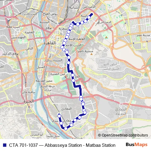 The first stop of the CTA 701-1037 bus route is Al Qobba Al Fidaweyya Mosque (Abbaseya) and the last stop is Dar Al Salam Police Station. CTA 701-1037 (Abbasseya Station - Matbaa Station) is operational during يومياً.