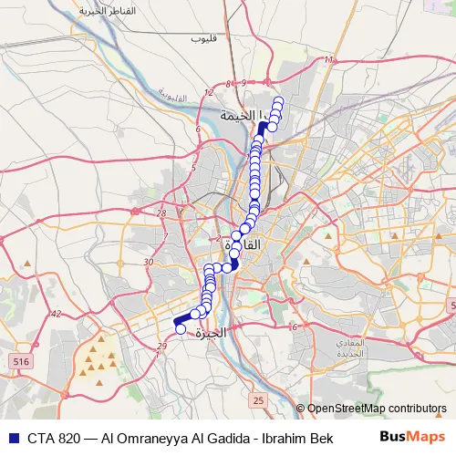 The first stop of the CTA 820 bus route is Ibrahim Bek and the last stop is Al Omraneyya Al Gadida. CTA 820 (Al Omraneyya Al Gadida - Ibrahim Bek) is operational during يومياً.