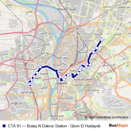 The first stop of the CTA 91 bus route is Hadayek Al Qobba Police Station and the last stop is East Bulaq Dakrur (Nahya). CTA 91 (Bulaq Al Dakrur Station - Qism El Hadayek) is operational during يومياً.