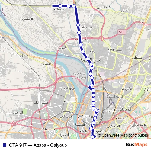The first stop of the CTA 917 bus route is Emad El Deen St. & 26th of July St. and the last stop is Qalyoub Al Balad Bus Station. CTA 917 (Attaba - Qalyoub) is operational during يومياً.