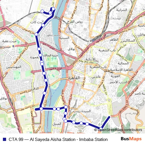 The first stop of the CTA 99 bus route is Imbaba and the last stop is Magra Al Oyoun (Salah Salem). CTA 99 (Al Sayeda Aisha Station - Imbaba Station) is operational during يومياً.