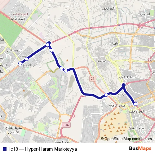 The first stop of the Ic18 bus route is Haram Marioteya and the last stop is Hyper One - Sheikh Zayed. Ic18 (Hyper-Haram Marioteyya) is operational during يومياً.