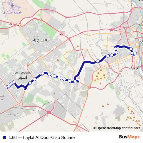 The first stop of the Ic66 bus route is Laylat Al Qadr and the last stop is Giza Square. Ic66 (Laylat Al Qadr-Giza Square) is operational during يومياً.