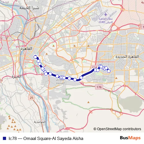 The first stop of the Ic78 bus route is Al Sayeda Aisha and the last stop is Ommal Square - 5th Settlement. Ic78 (Omaal Square-Al Sayeda Aisha) is operational during يومياً.