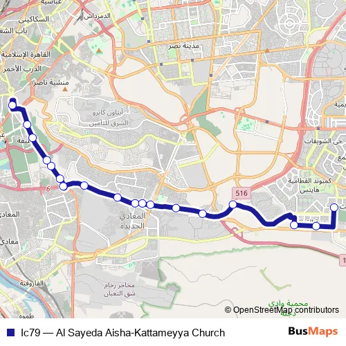 The first stop of the Ic79 bus route is Al Sayeda Aisha and the last stop is Kattameya Church. Ic79 (Al Sayeda Aisha-Kattameyya Church) is operational during يومياً.