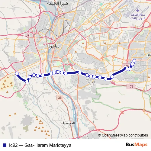 The first stop of the Ic92 bus route is Haram Marioteya and the last stop is Gas - 5th Settlement. Ic92 (Gas-Haram Marioteyya) is operational during يومياً.